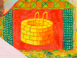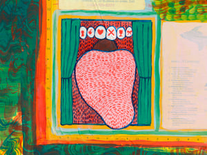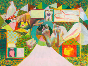 Dream symbolism has always been significant to me and I keep careful record of any dream with strong emotional elements. Walking Into a Lucid Dream is a compendium of symbols from dreams I have recorded over the past two years, painted over a map of Michigan’s Upper Peninsula, where I resided during that time.